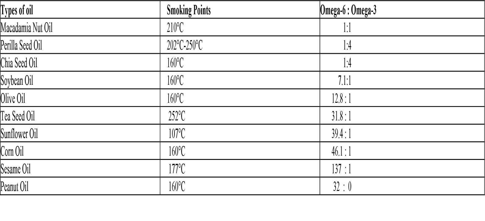 Smoking points of common cooking oils and the ratio of omega-6 to omega-3 fatty acids: